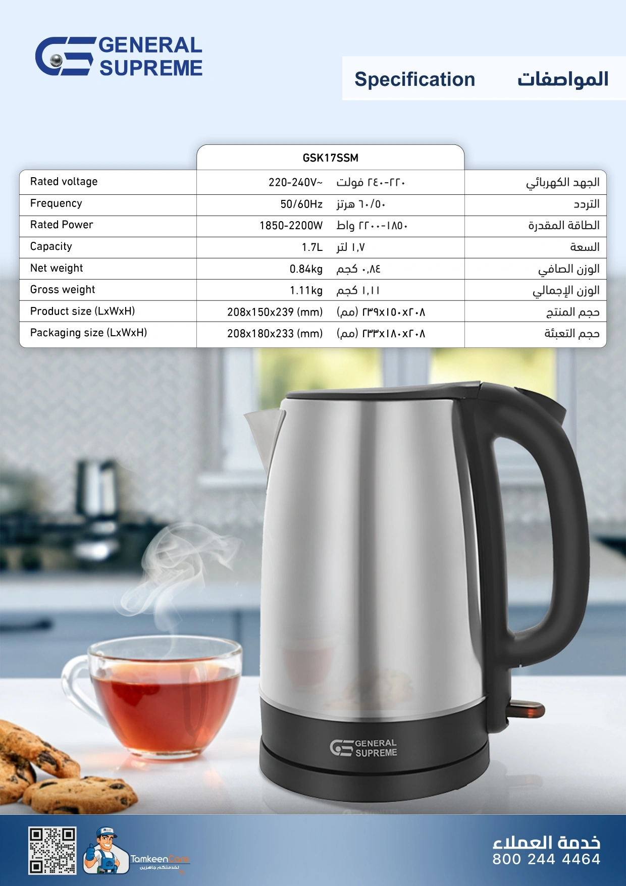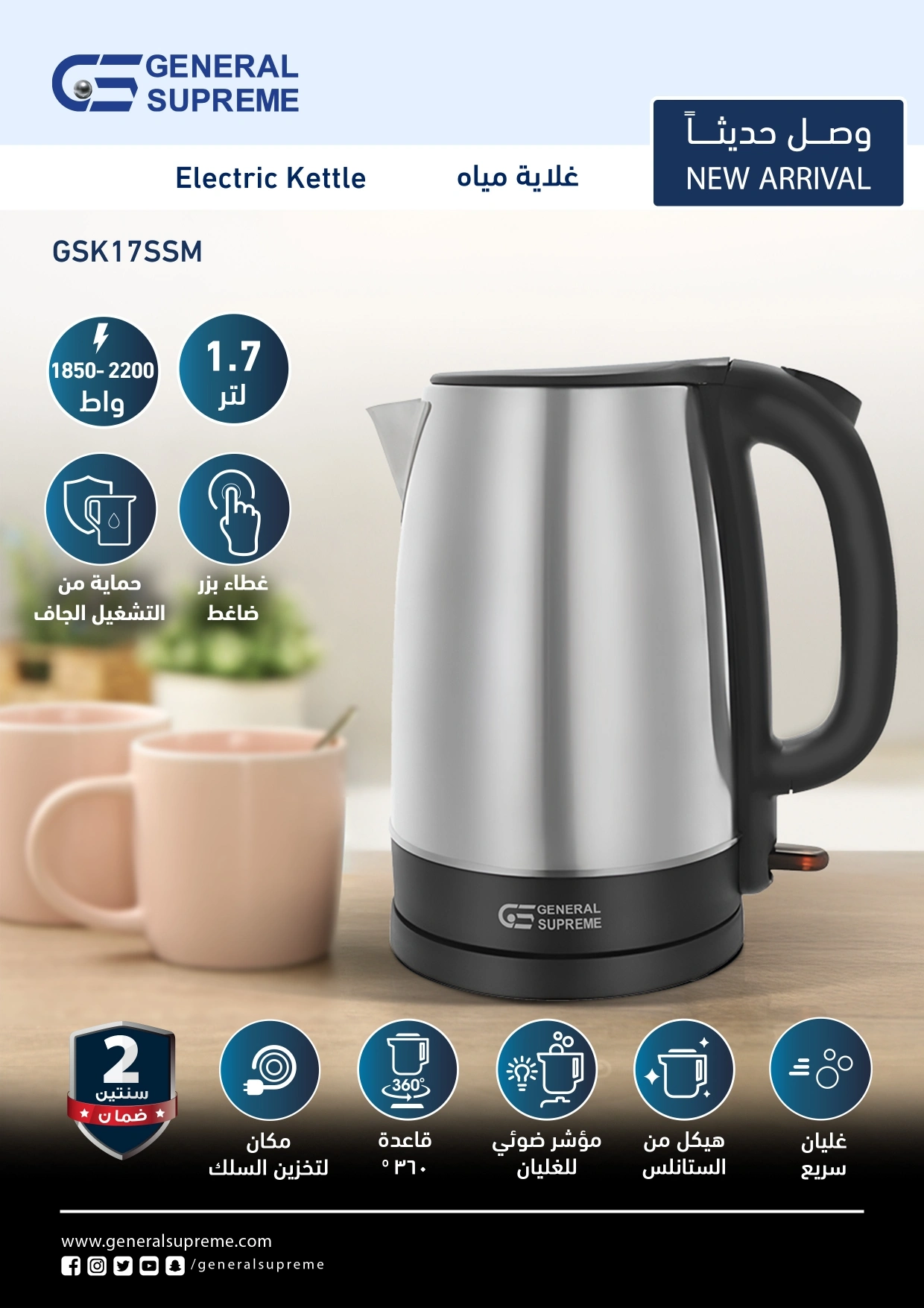 احصل على غلاية المياه الكهربائية جنرال سوبريم GSK17SSM التي تجمع بين السرعة والكفاءة. مع قوة تتراوح بين 1850-2200 واط، توفر لك هذه الغلاية القدرة على تسخين المياه في دقائق معدودة، مما يجعلها مثالية لمشروباتك اليومية الساخنة.